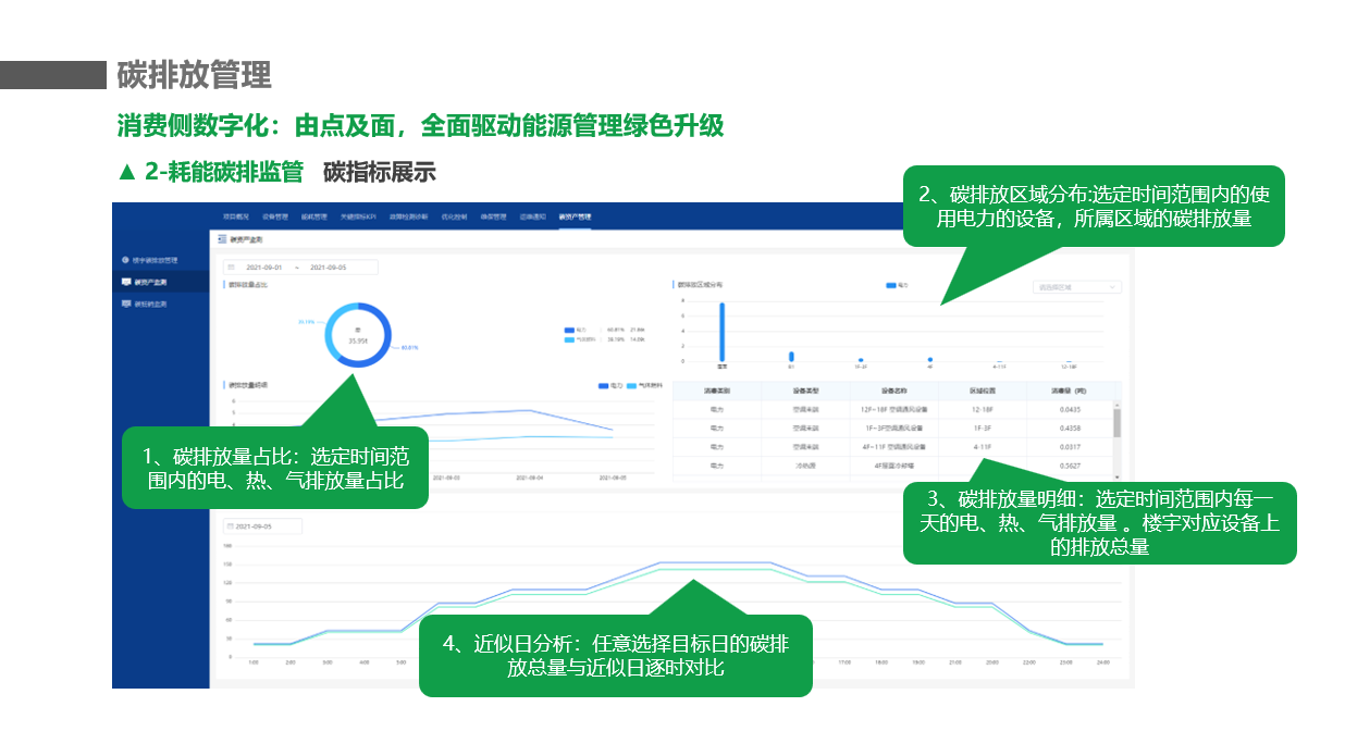 3:碳排放量明细: 选定时间范围内每天的电、热、气排放量 。楼宇对应设备上的排放总量。